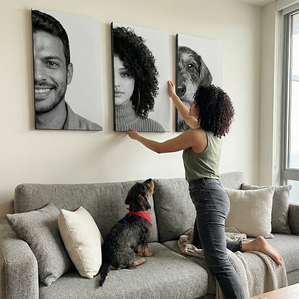 Design Exclusivo: Não apenas fazemos quadros, criamos uma peça de design única baseada nos traços reais da sua família ou pets.